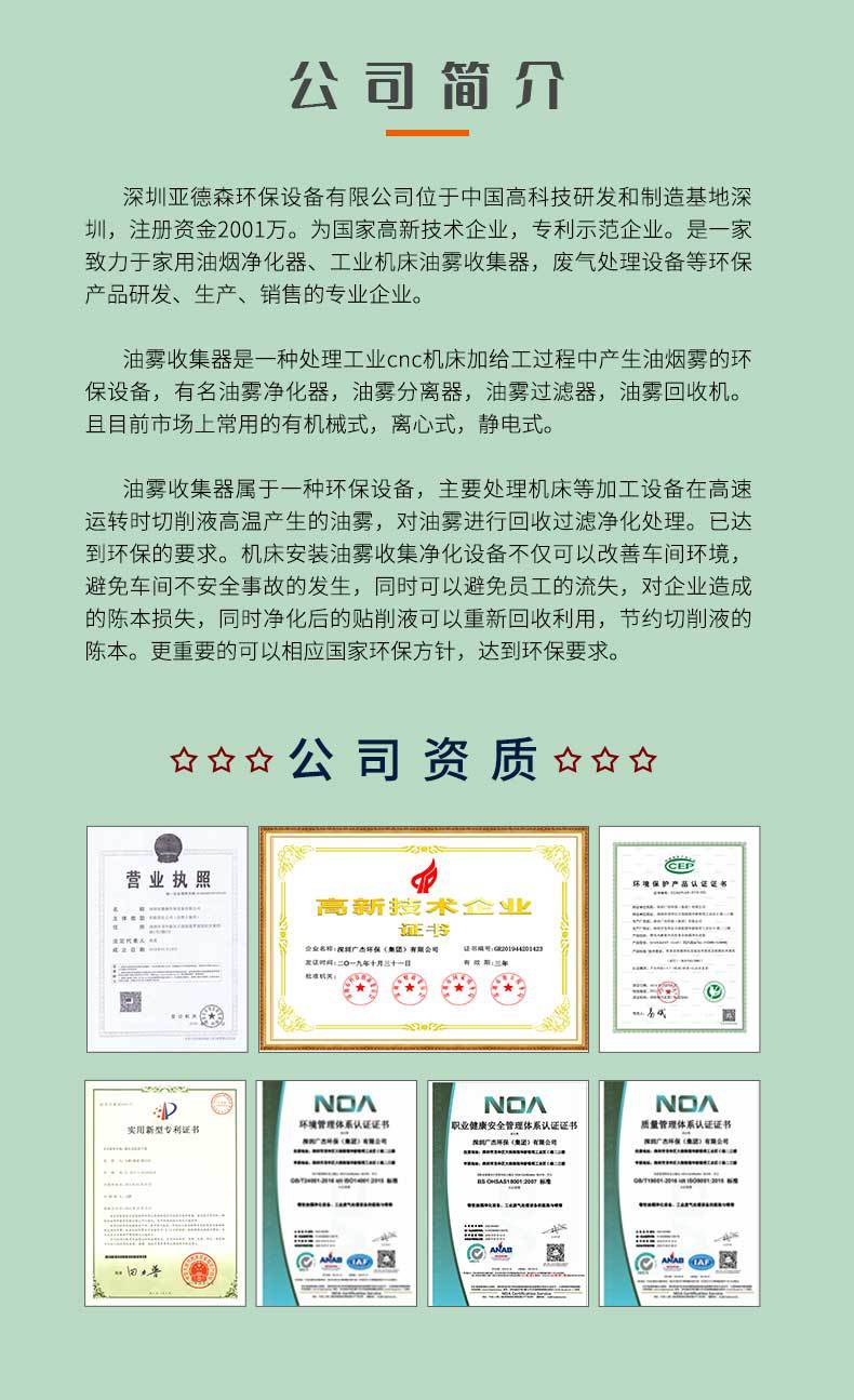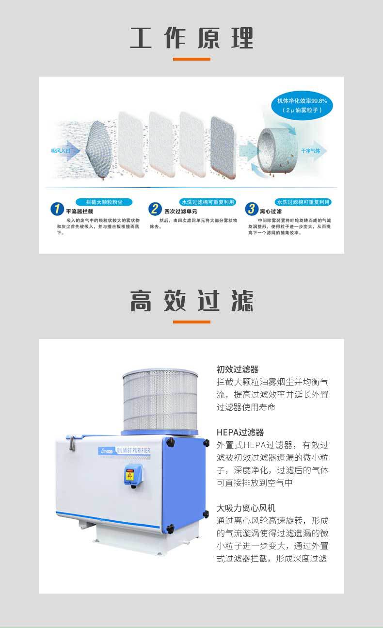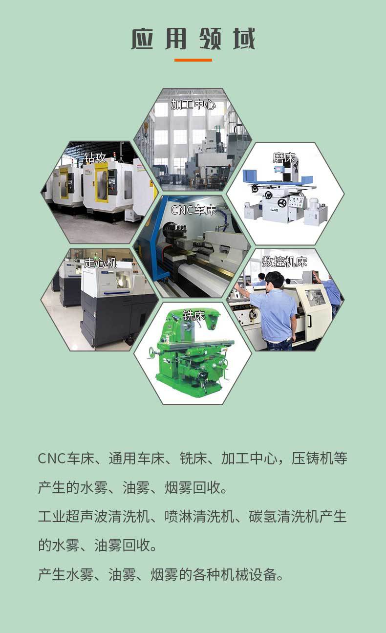 4、可以捕集雾状物和粉尘,可捕集平面磨床、无心磨床等生产的切屑,可用于电火化机床、调整数控机床、高效齿轮加